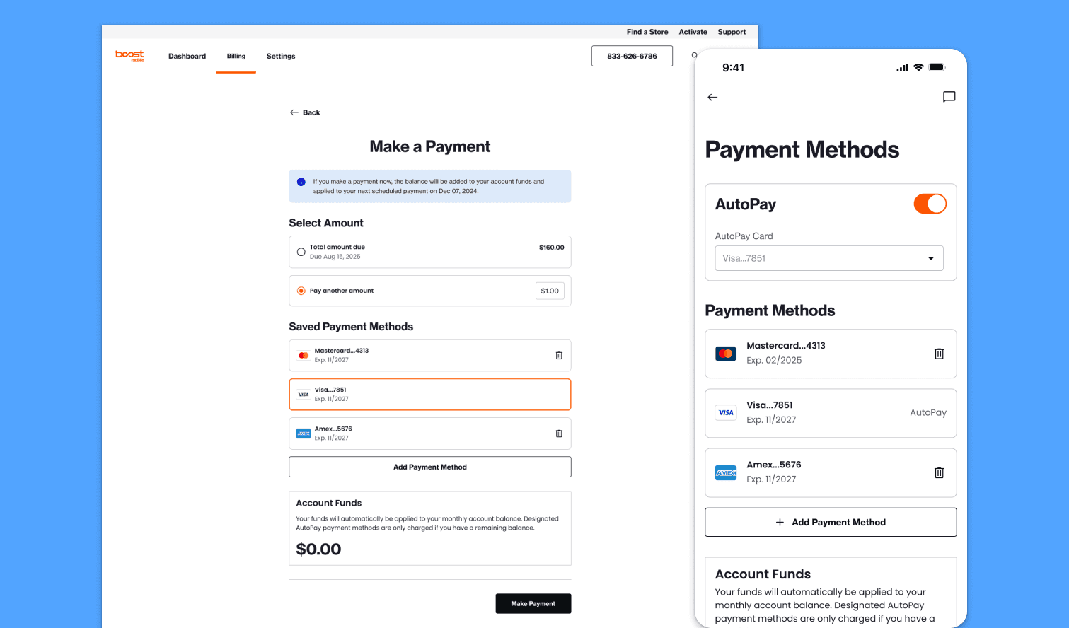 I designed payment flows that allow customers to make payments, add and update payment methods. As part of this work, I simplified the process by consolidating all payment method options into a single page.